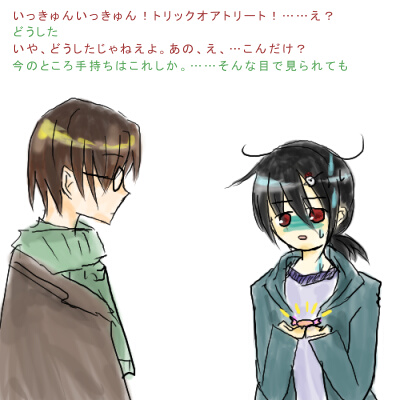 「いや出さないぞ、うん。というかその年でお菓子貰いに来たのか(しかも年下相手に)」